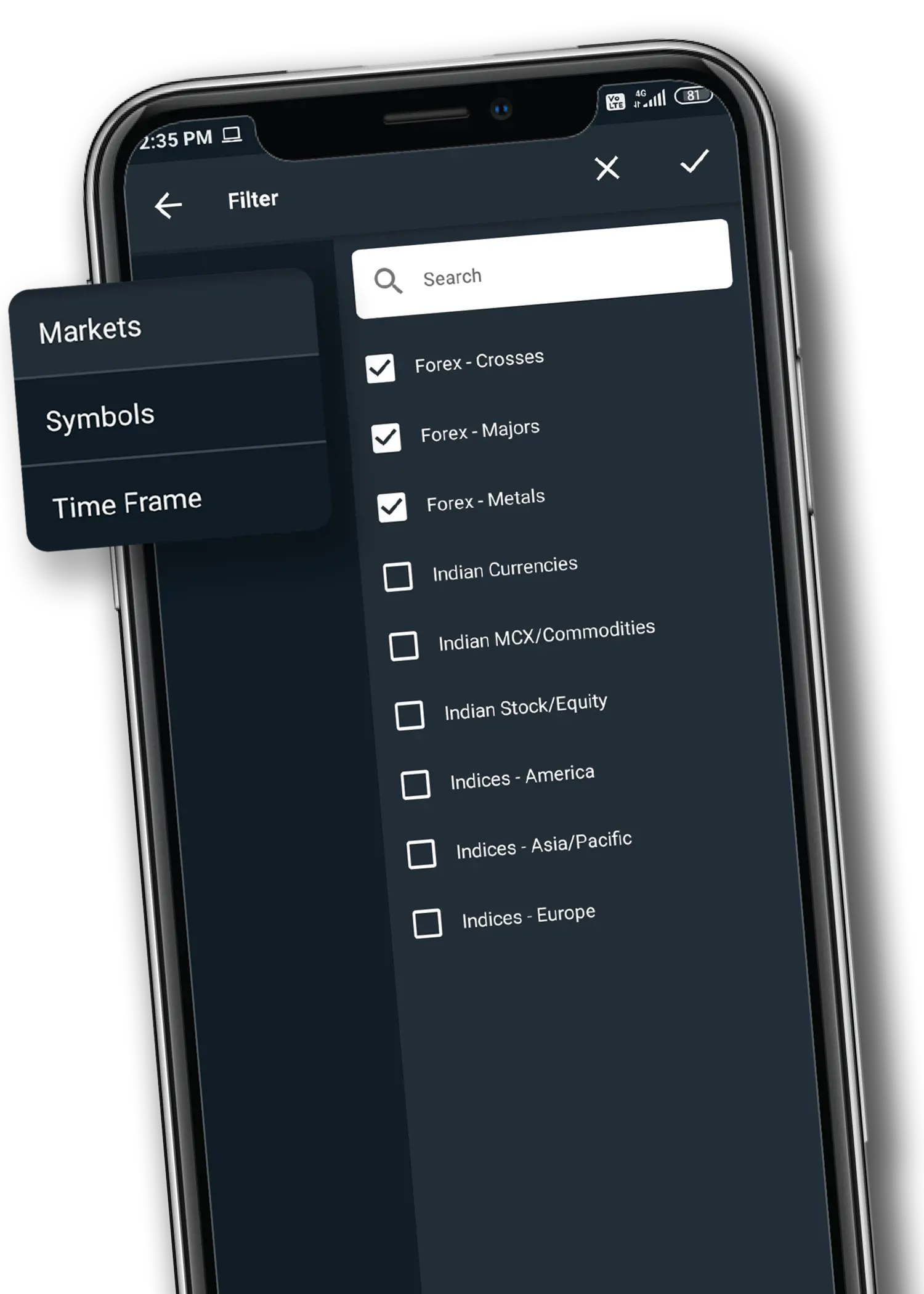 This facilitates users to filter their choices of their preferred market along with the scripts of their choice and the decided time frames & further users are alerted when the particular patter is formed in their choice of filters.